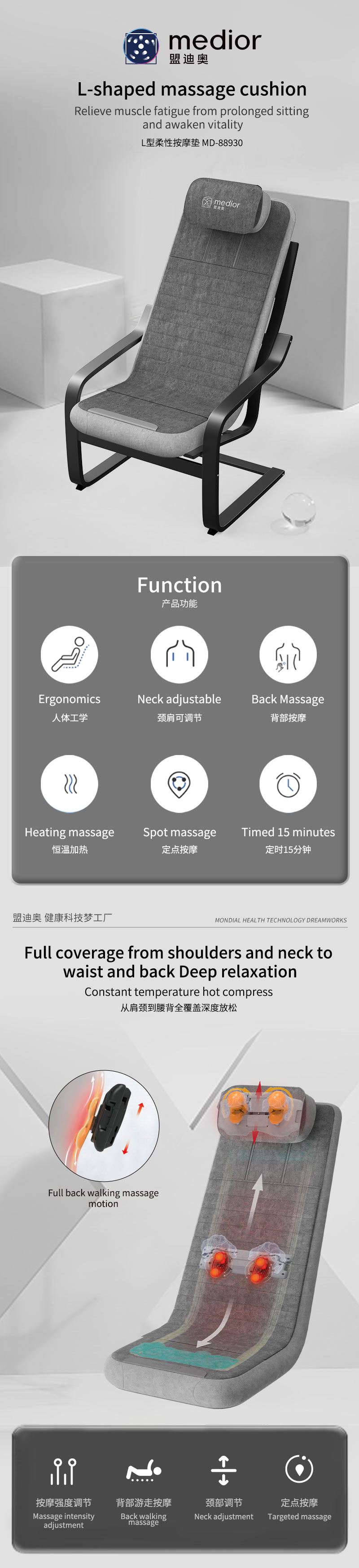 1、L型機(jī)芯結(jié)構(gòu),對折包裝縮小體積2、獨(dú)家專利柔性機(jī)芯3、力度三檔調(diào)節(jié),定點(diǎn)按摩,腰背按摩、臀腿按摩、全背按摩模式選擇4、背部行走揉捏,按摩區(qū)域加長到從肩膀到大腿;5、更加貼合不同款式的椅子整體可對折收納