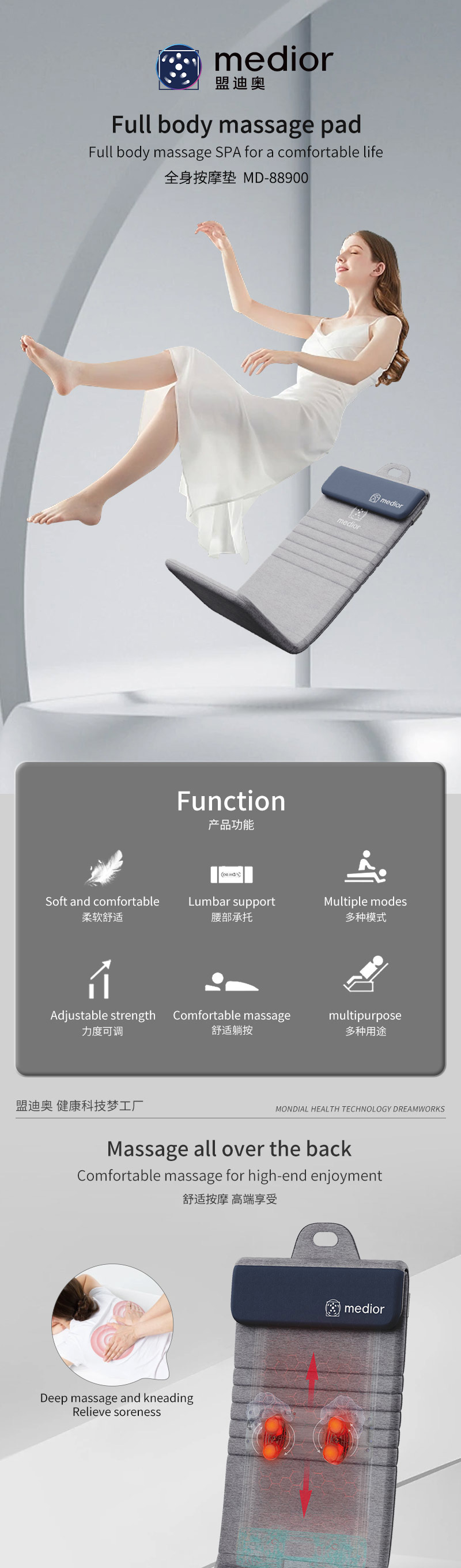 3、力度三檔調(diào)節(jié),定點(diǎn)按摩,腰背按摩、臀腿按摩、全背按摩模式選擇