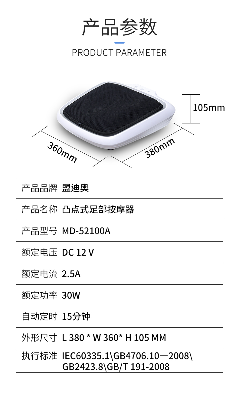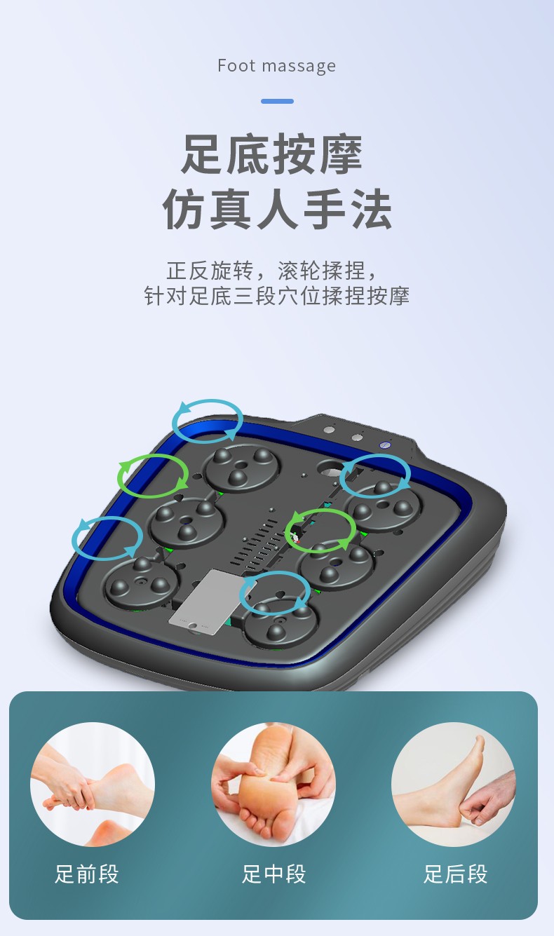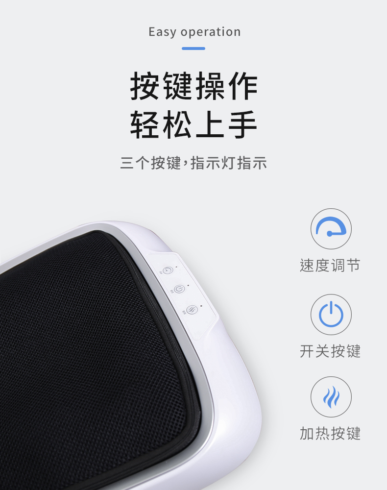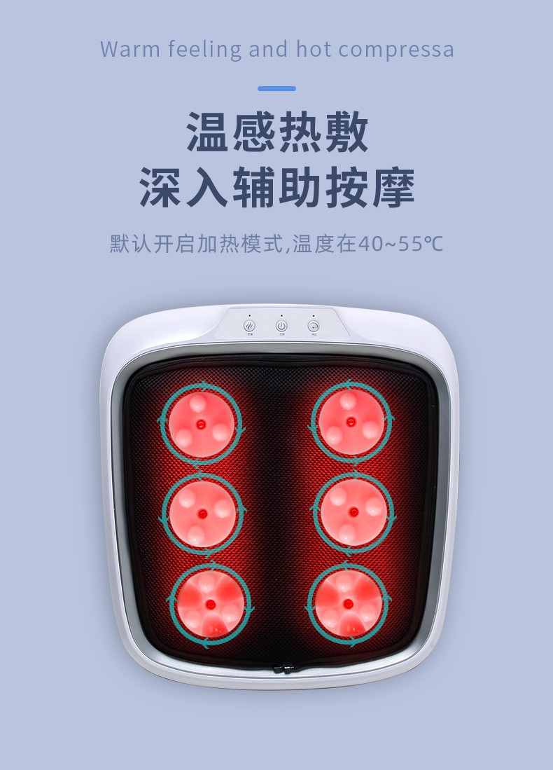 功能特征:腳底六個按摩頭,三檔力度調(diào)節(jié),按摩頭正反轉(zhuǎn),按摩頭加熱,15分鐘定時,可拆洗腳套,按鍵控制面板